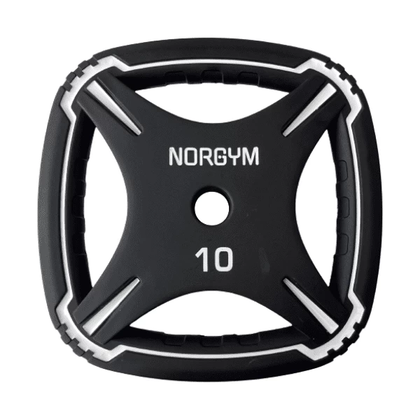 Denne 10kg vægtskive i stål er belagt med Poly Urethane. Skiven er designet så den passer til vores Norgym Pro Pumpset. Den har håndtag, så du kan bruge vægtskiven til andre enkelthånds træningsøvelser.